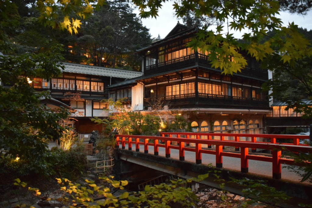 A short walk from the heart of Shima Onsen sits Sekizenkan Ryokan, a place often whispered about among travelers tracing historical architecture. Its red bridge reflects in the river below, creating that postcard-perfect image that seems too cinematic to be real. Some say it inspired the bathhouse in Studio Ghibli’s “Spirited Away,” and whether or not that’s true, the ryokan certainly has an otherworldly charm.