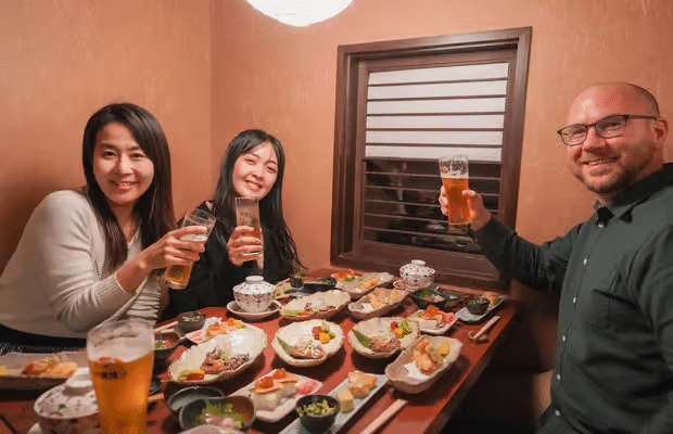 Contact Jasumo Now →The tour begins in front of the Izumo-no-Okuni statue at Gion Shijo Station. From there, we explore the atmospheric Gion district, known for its preserved Kyoto-style buildings and occasional geisha sightings. Your local guide will take you to a hidden, traditional restaurant where you’ll sample Kyoto-style appetizers such as obanzai (Kyoto home cooking), oden (Japanese hot pot), or yuba (tofu skin), paired with local Japanese sake.