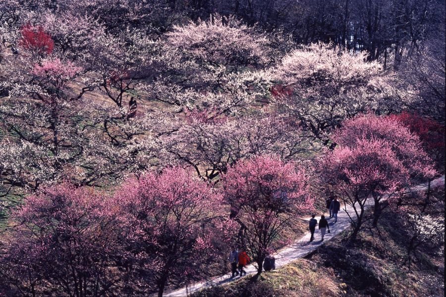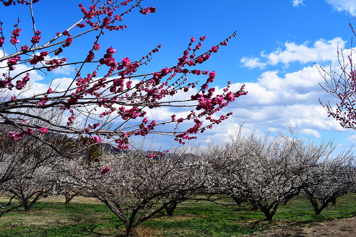 Akima Plum Grove (Akima Bairin) was established in the 1960s when local farmers in Annaka’s Akima district planted thousands of plum trees on former mulberry fields abandoned after the decline of silk production. The south-facing slopes and volcanic soil proved perfect for ume cultivation, and by the 1980s, over 35,000 trees had been planted—earning Akima a place among Gunma’s “Three Great Plum Groves” alongside Misato and Yabuzaki.