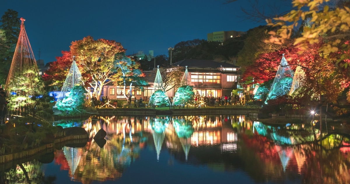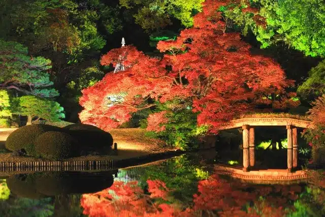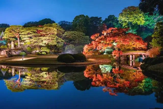 Rikugien Garden is one of Tokyo’s most celebrated spots for viewing autumn leaves. During the peak of the season, the garden hosts a spectacular nighttime illumination, drawing both locals and international visitors to witness the stunning colors of fall enhanced by soft lighting.