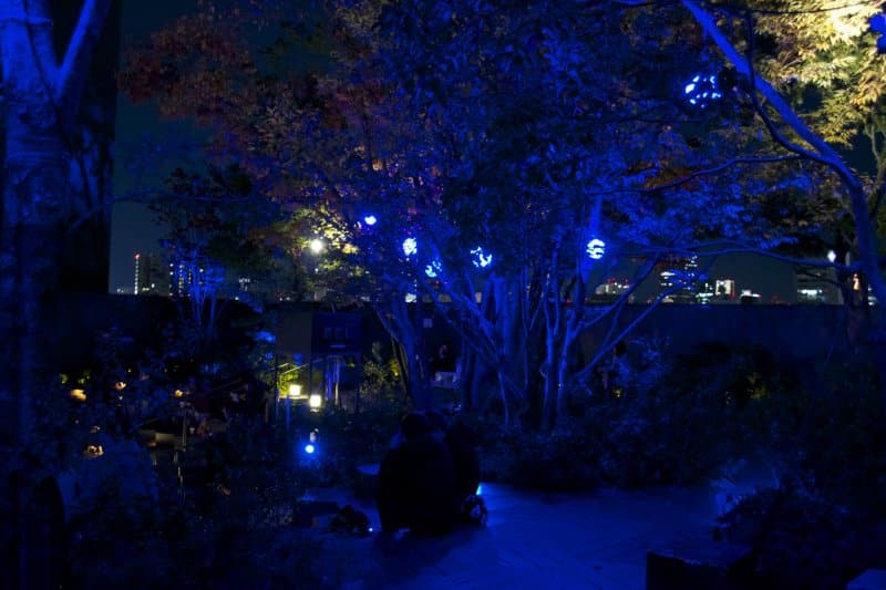 The event features a rooftop forest with hanging lights, cozy seating, and panoramic views of Tokyo’s fashion district, creating a romantic and festive winter experience.