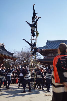 • Traditional Edo-era ladder acrobatics performed by expert steeplejacks.