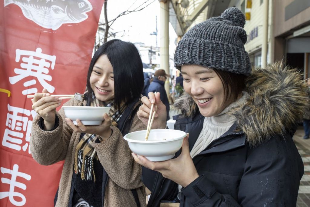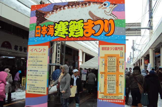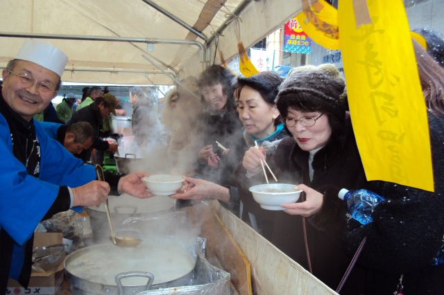 It’s a winter festival in Tsuruoka celebrating dongara jiru, a traditional cold cod soup from Yamagata Prefecture.