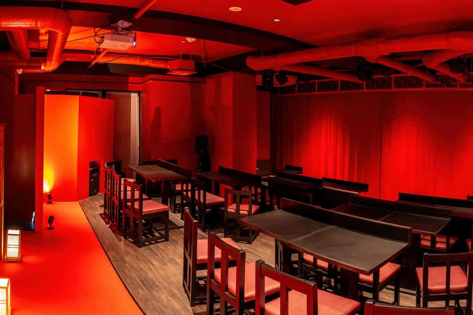As you arrive, you’ll be welcomed into a bold red-themed interior reminiscent of Japan’s iconic aesthetic. Enjoy your complimentary drink while mingling with the cast or taking photos at the themed photo booth.