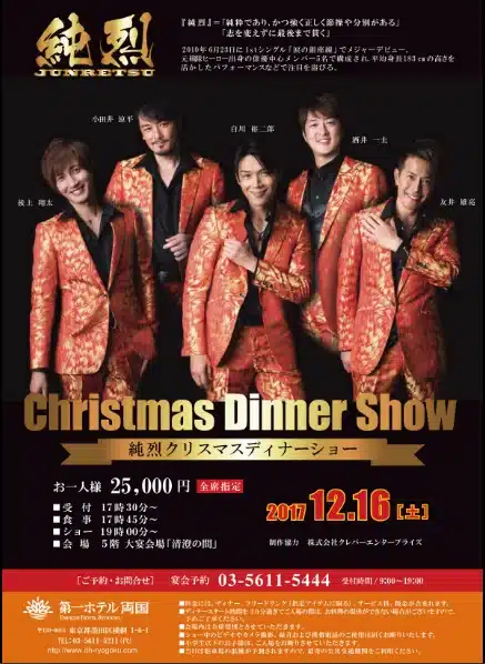 Celebrate the holiday season with an unforgettable live performance and exquisite dining experience at the Junretsu Christmas Dinner Show. This exclusive event combines the charm of Junretsu’s iconic vocals with a carefully curated gourmet meal, creating a magical Christmas atmosphere for fans in Fukuoka.