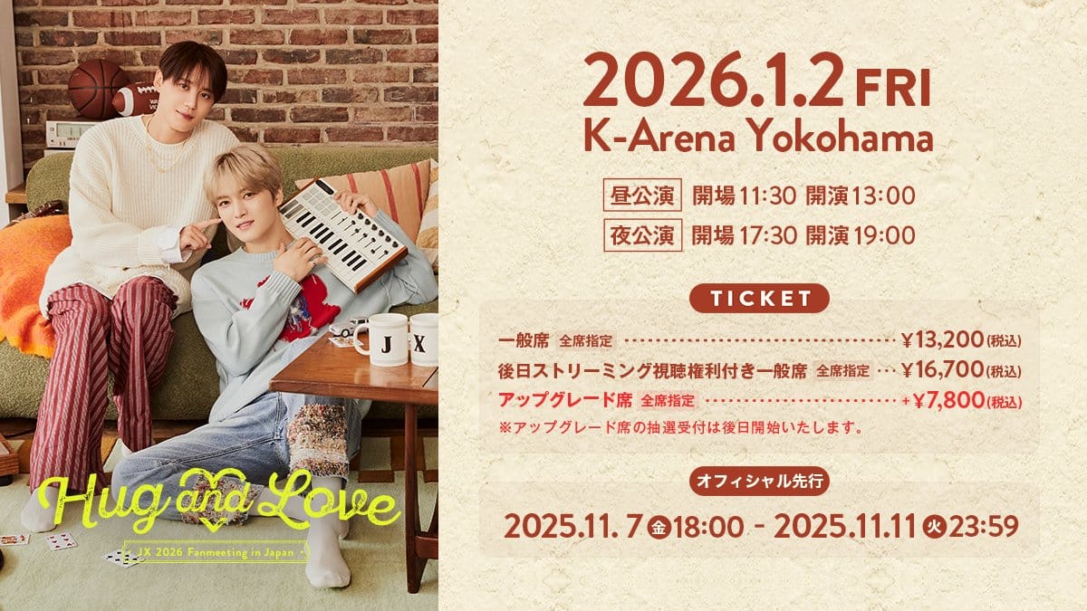 JX 2026 JAPAN FANMEETING ‘Hug & Love’ is a charming, intimate fan-engagement odyssey by JX (the duo of JAEJOONG [Kim Jaejoong, born 1986 in Seoul, ex-TVXQ, solo since 2012 with hits like “Mine” and “Love in the Ice”] and XIA [Kim Junsu, born 1986 in Gwangju, ex-TVXQ, known for musical theater and R&B like “Tarantallegra”]), celebrating their first Japan fanmeeting since 2024’s concert.