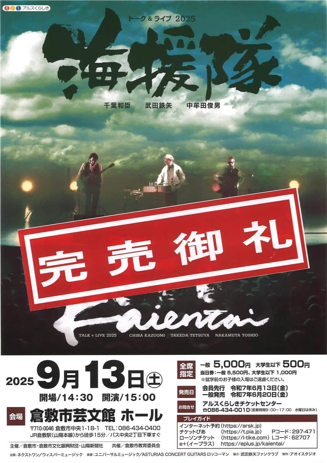 Kaientai Talk & Live 2025 is a unique blend of music and storytelling featuring the iconic Japanese folk-rock band Kaientai, led by Tetsuya Takeda, alongside Kazuomi Chiba and Toshio Nakamuta. Known for their nostalgic hits and engaging live performances, Kaientai delivers a mix of heartfelt songs and entertaining banter, resonating with audiences through their folk-inspired sound and relatable lyrics. Praised on X for their “timeless melodies” and “warm stage chemistry,” this event is a cultural highlight in Iwate Prefecture. Scheduled for October 19, 2025, at 15:00 at the Ninohe Civic Cultural Center Large Hall, the performance offers an intimate experience in a region rich with history, near attractions like Ninohe Buried Cultural Property Center and Nohe Castle Ruins. With affordable pricing (¥5,500) and limited seating (~500–700), this concert is ideal for music fans and tourists exploring northern Japan. Early booking is recommended due to high demand.