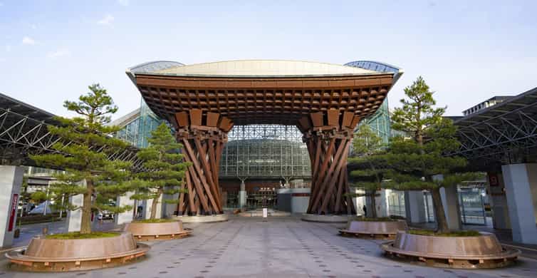 Near Kanazawa Station, under the train overpass where green electric bicycles are parked. Your guide will be holding a blue flag marked with the company name: New Japan Tourist.