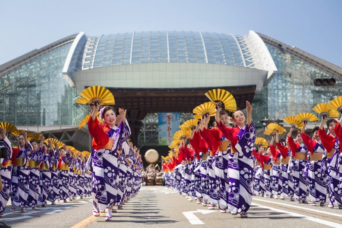 Locals dressed in colorful yukata perform traditional Hyakumangoku Odori dances.