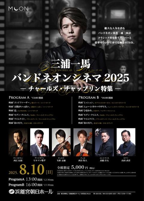 Acclaimed Japanese bandoneonist Kazuma Miura, a protégé of legendary Nestor Marconi and winner of the 2008 International Piazzolla Competition, presents Bandoneon Cinema 2025 Charles Chaplin Special, a captivating 70-minute cinematic concert blending tango-inspired arrangements with iconic film scores. Joined by elite classical musicians, Miura delivers lush interpretations of Chaplin classics like “Smile” from Modern Times and “Terry’s Theme” from Limelight, alongside works by Nino Rota (The Godfather, La Strada) and Ennio Morricone (Cinema Paradiso). Praised on X for his “virtuosic bandoneon” and “evocative storytelling through music,” these performances evoke the golden age of cinema. The tour features two programs: Program A (13:00) with Rota and Chaplin themes, and Program B (16:00) with Morricone and Chaplin selections. Running from August 10 to October 26, 2025, in Tokyo and Osaka, the shows take place at intimate venues like Hamarikyu Asahi Hall (~300 capacity) and Aioi Nissay Dowa The Phoenix Hall (~1,000 capacity), following Miura’s successful collaborations with Martha Argerich and Yuri Bashmet.