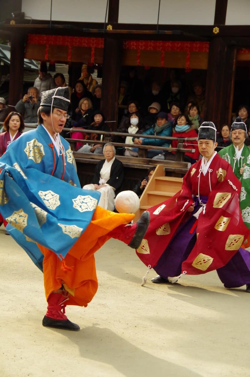 Kemari Hajime is an annual New Year ceremony held at Shimogamo Shrine in Kyoto, dedicated to preserving the ancient tradition of Kemari. Participants, dressed in traditional Heian-period attire, perform the ceremonial game, kicking a leather ball in a coordinated manner without letting it touch the ground. The ritual demonstrates skill, precision, and teamwork, combining sport and artistry.