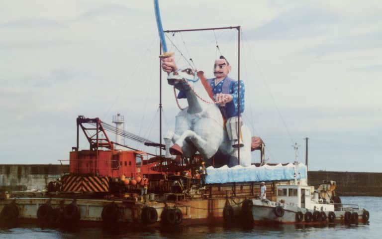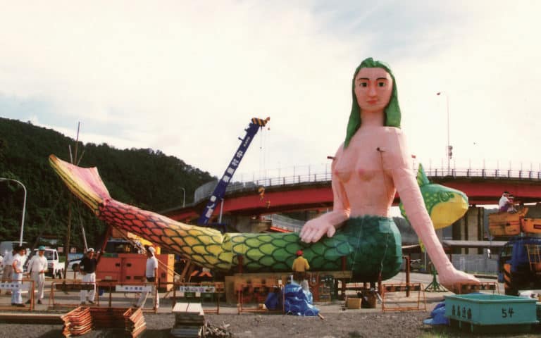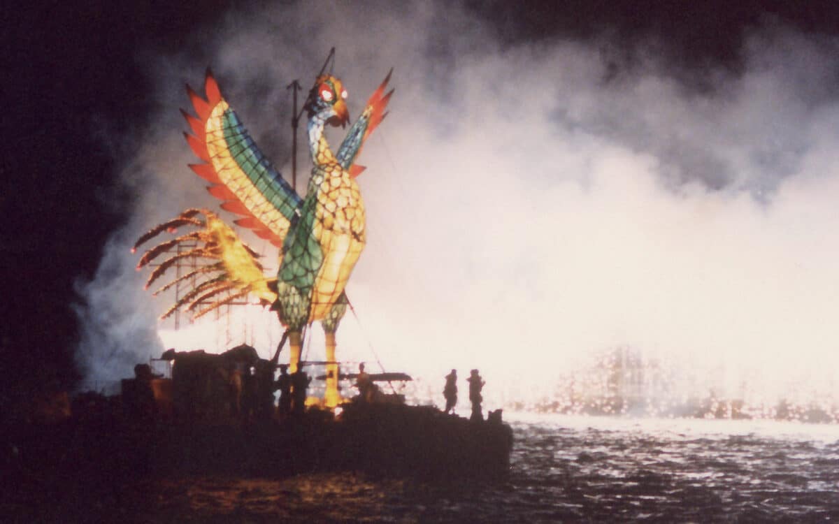 Developed over three years, this dramatic fireworks display was designed to overcome the physical limitations of the launch site. The result is a breathtaking, rainbow-like explosion resembling a peacock’s feathers fanned out in the sky. This signature display is only seen at this festival.