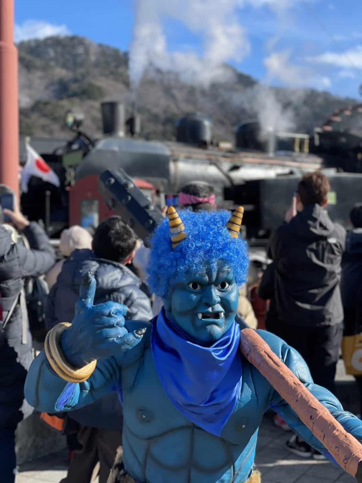 One of the festival’s main attractions is the SL Shōfuku Oni Train, a steam locomotive ride featuring costumed demons and local mascots. Alongside the train, visitors can enjoy taiko drumming, wood-carving demonstrations, and a variety of demon-themed gourmet foods.
