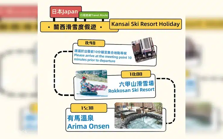 Note: Ski lessons available for ages 6+. Hot spring fees at Arima not included. Due to Japanese vehicle time limits (max 10 hours), the itinerary may be adjusted based on traffic and conditions.
