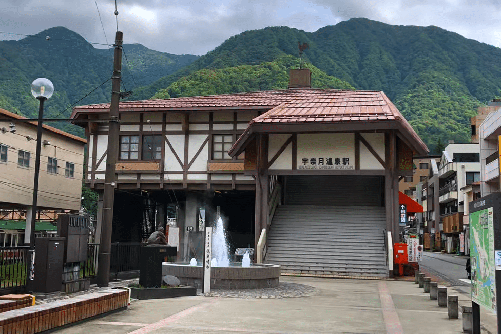 After a short walk to Shin-Kurobe Station, take a brief local train ride to Unazuki Onsen Station, nestled in the mountains. Founded just over a century ago, Unazuki Onsen is known for its crystal-clear spring water and charming Taisho-era buildings that reflect a mix of Western and Japanese influences.