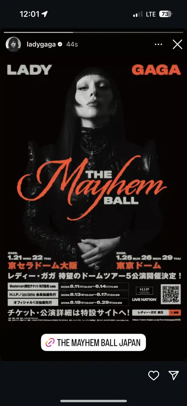 Lady Gaga, the global pop icon, brings her The MAYHEM Ball tour to Japan in support of her eighth studio album, MAYHEM, which debuted at No. 1 in 12 countries and amassed over 5.2 billion streams worldwide. The tour features five massive shows at Kyocera Dome Osaka and Tokyo Dome in January 2026, showcasing hits like “Abracadabra,” “This Is Lady Gaga,” and classics such as “Bad Romance” and “Born This Way.” Expect a ~2-hour spectacle with extravagant costumes, stunning visuals, and emotional performances. Posts on X describe it as a “life-changing” event, with ~150,000 attendees expected across the shows. A portion of each ticket’s proceeds supports the Born This Way Foundation, founded by Gaga and her mother in 2012 to promote youth mental health and wellness.