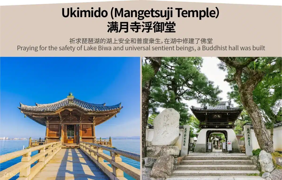Located along the northern shore of Lake Biwa, Mangetsu-ji Temple is home to the Ukimido (Floating Hall), a wooden pavilion extending over the lake via a stone causeway. This site is one of the “Eight Views of Ōmi” and is celebrated in Japanese poetry and art. The hall enshrines a statue of the Kannon Bodhisattva and provides a quiet place for reflection with views of the calm, glistening lake.