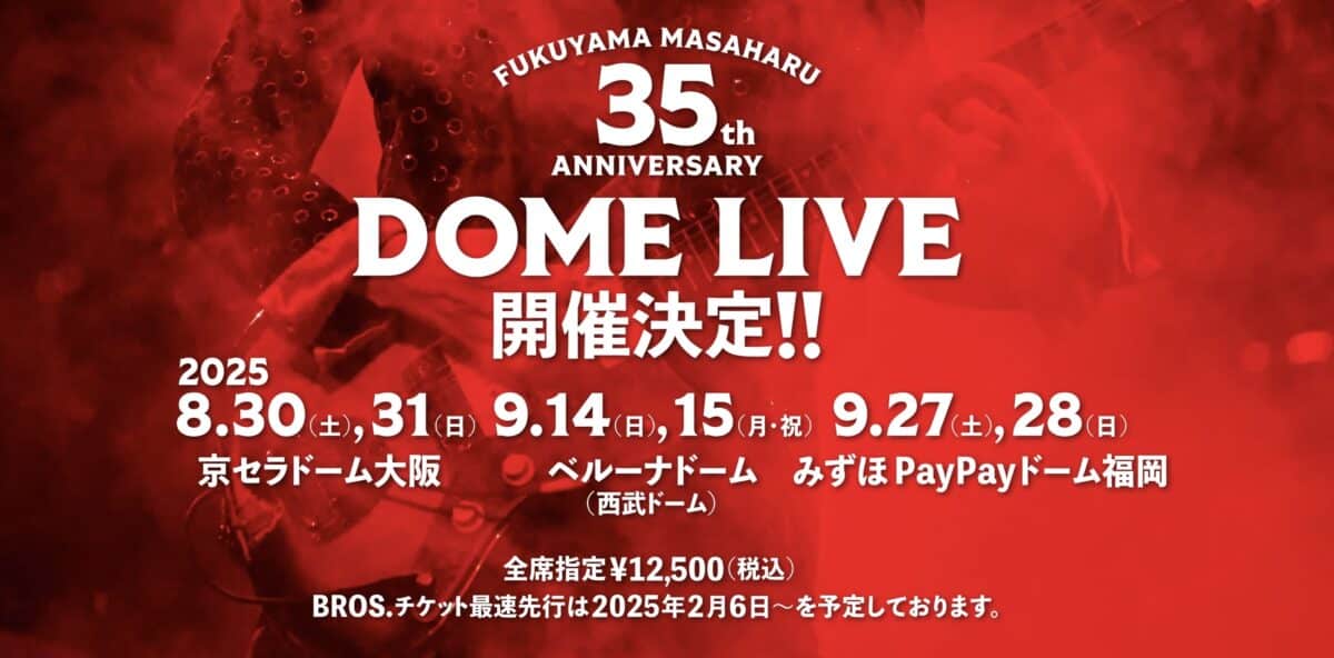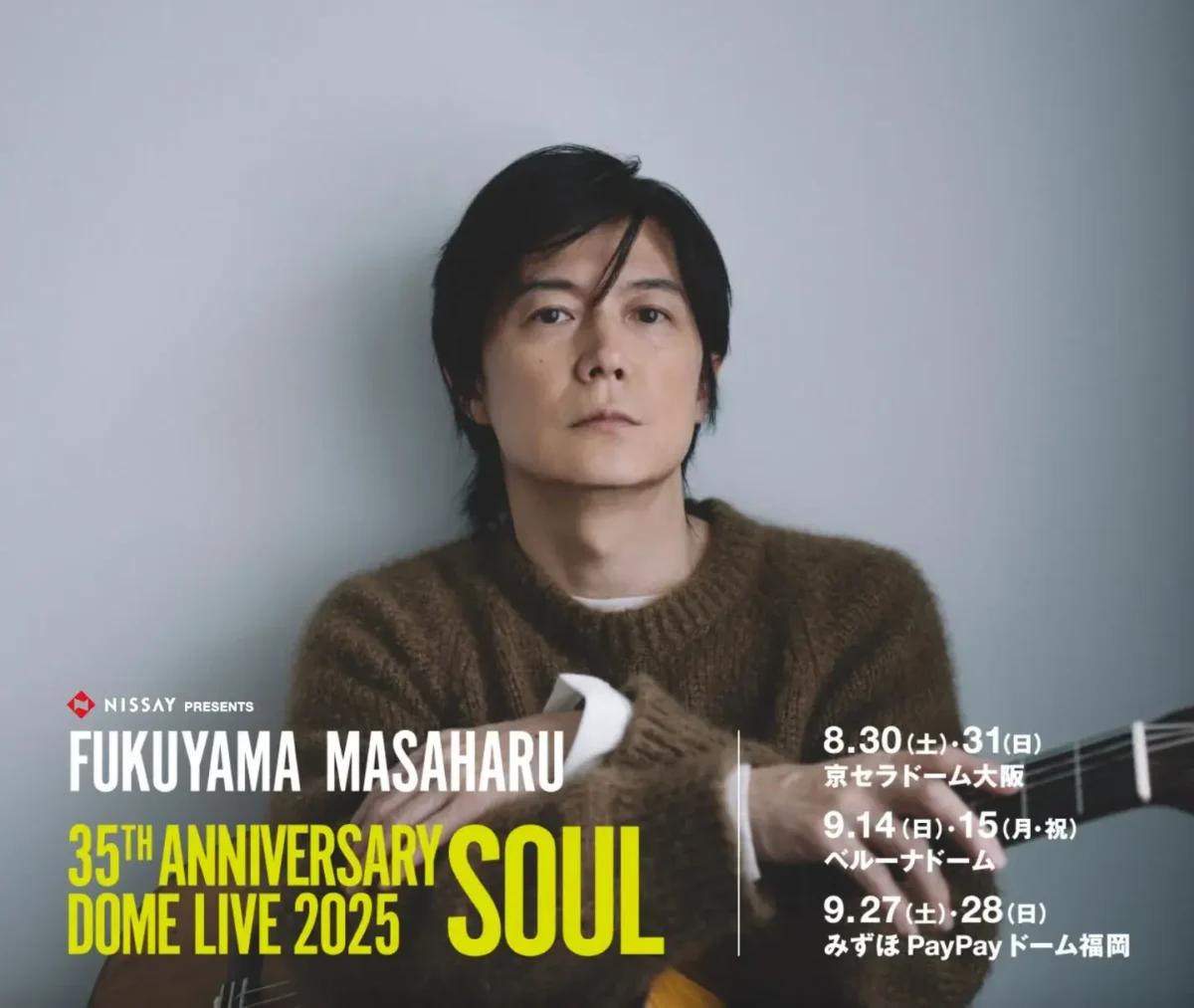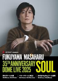 Celebrating his 35th anniversary since his debut in 1990, Masaharu Fukuyama, the iconic Japanese singer and actor, presents FUKUYAMA MASAHARU 35TH ANNIVERSARY DOME LIVE 2025 // SOUL, his first dome concert tour in seven years. This highly anticipated tour visits three major cities—Osaka, Saitama, and Fukuoka—featuring (55,000 capacity) and Mizuho PayPay Dome (~40,000 capacity), this tour is a milestone celebration of his illustrious career.
