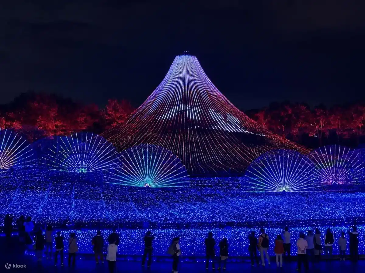 Step into a glowing wonderland at Nabana no Sato, home to Japan’s largest illumination display. Wander through the famous Tunnel of Lights, admire intricate sculptures, and explore seasonal gardens featuring cherry blossoms, tulips, and begonias (visible before sunset). The “Scenery of Japan” theme brings the country’s landscapes and culture to life with vibrant lights and music.
