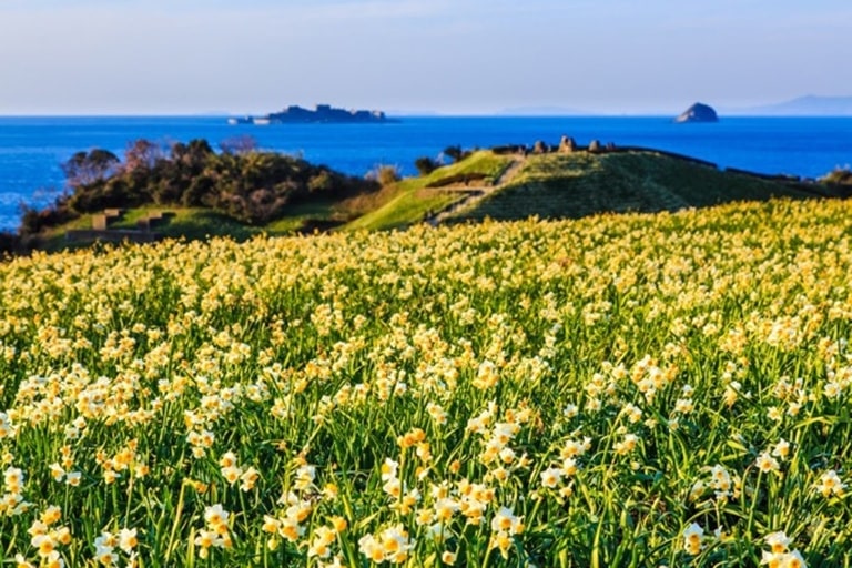 Visitors can enjoy 10 million daffodils, panoramic sea views, and the historic Gunkanjima (Battleship Island).