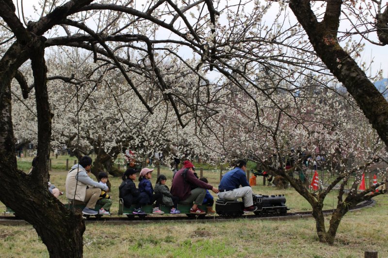 During the festival, a ¥300 entry fee applies (free outside festival period). Highlights include the mini steam locomotive chugging through the grove (weekends/holidays), live performances, food stalls, bonsai & ceramics markets, and the adorable mascot Umerin greeting visitors. Select nights may feature illumination for romantic evening viewing. The gentle terrain and fresh mountain air make it ideal for relaxed hanami.