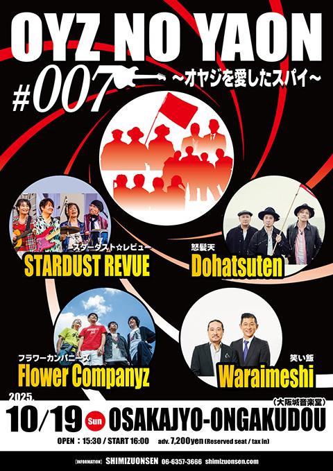 The OYZ NO YAON #007 – The Spy Who Loved the Old Man is a vibrant outdoor rock concert on October 19, 2025, at 16:00 at Osaka Castle Music Hall, featuring a dynamic lineup of Japanese bands: Stardust Revue, Dohatsuten, Flower Companyz, and Warai-meshi. Held in the lush Osaka Castle Park, this event is part of the iconic OYZ NO YAON series, known for its high-energy performances and nostalgic J-rock vibe. The program includes hits from Stardust Revue’s 40-year catalog, Dohatsuten’s punk-infused energy, Flower Companyz’s melodic rock, and Warai-meshi’s comedic yet soulful style, as noted on X for their “electrifying stage presence.” The open-air Osaka Castle Music Hall (3,000 seats) offers a unique setting with fixed seats (1,837), movable chairs (108), and lawn seating (1,000), blending intimacy with festival vibes (). Tickets are ¥7,200 (reserved seats) and ¥6,900 (lawn unreserved, numbered seats included), with free lawn entry for elementary school students and younger (seat requires reserved fee). Resale prices may reach ¥8,500–¥10,000 due to high demand. Perfect for J-rock fans and tourists near Osaka Castle or Dotonbori, early booking via Jasumo is essential due to limited capacity and the event’s popularity (,).