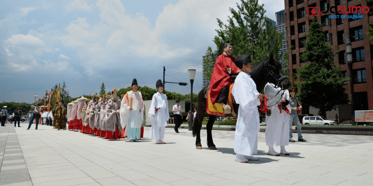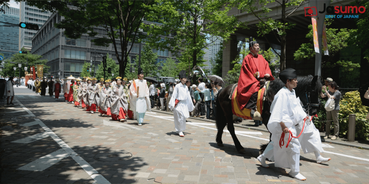 - Grand Procession Through Central Tokyo: Witness the iconic Jinkosai (神幸祭) procession, where portable shrines (mikoshi) and over 300 participants dressed in Heian-period attire parade through central Tokyo, stopping at key landmarks like the Imperial Palace and Tokyo Station.