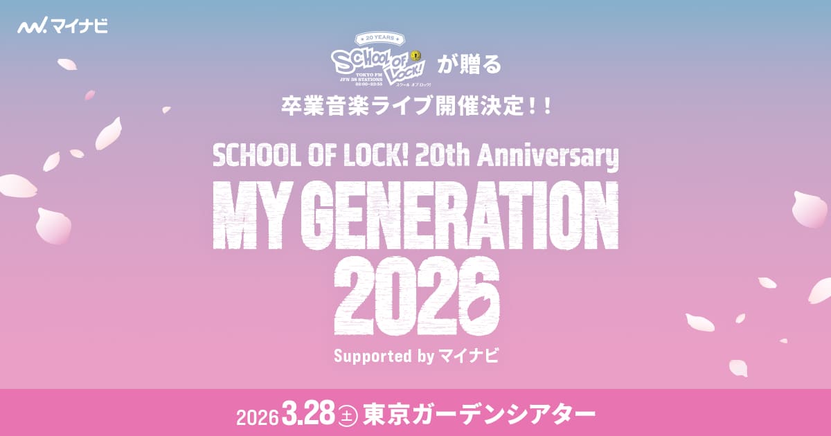 Celebrate two decades of the popular radio program “SCHOOL OF LOCK!” at their 20th Anniversary MY GENERATION 2026 music concert. This highly anticipated graduation event will feature an impressive lineup, including major Japanese acts SUPER BEAVER and GENERATIONS from EXILE TRIBE, alongside the program’s hosts, Principal Komori and Vice Principal Angie. Held at the spacious Tokyo Garden Theater, this is set to be a significant cultural and musical milestone.