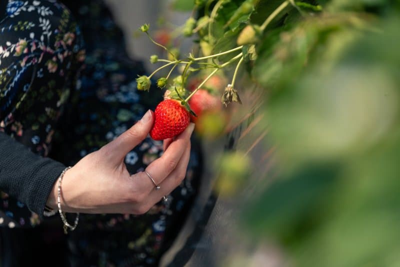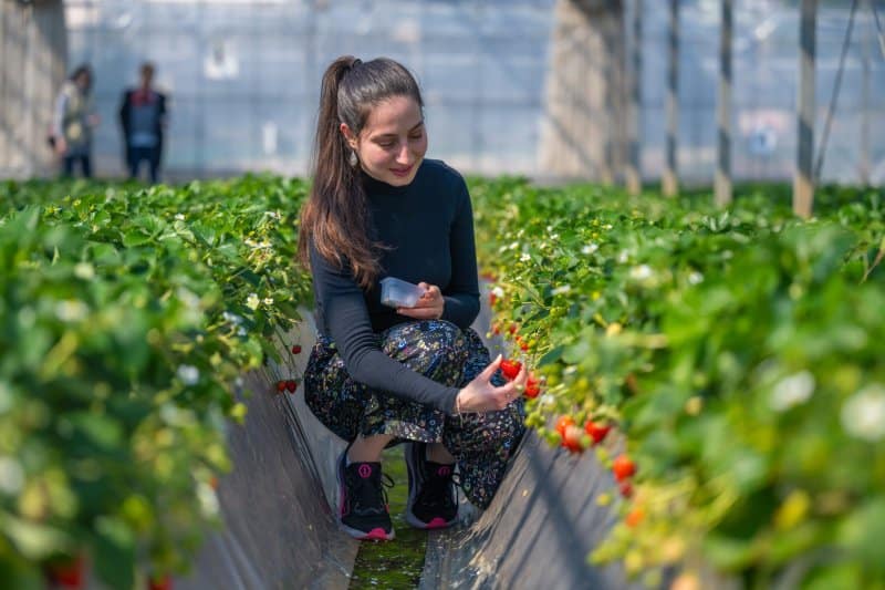 The farm grows multiple premium varieties, led by the ever-popular Beni Hoppe (deep red, perfectly balanced sweet-tart flavor) alongside newer cultivars still in testing—meaning visitors often taste berries years before they hit stores. Condensed milk is provided for dipping, but the strawberries are so sweet most people eat them straight off the plant.