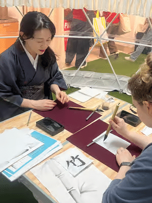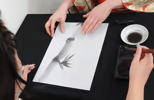 After refining your skills, you’ll move on to drawing bamboo on a shikisi board, followed by adding kanji characters like “竹” (bamboo) or “和” (harmony). You may also request other characters, and the instructor will assist with proper form and meaning.