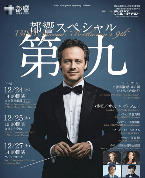 The Tokyo Metropolitan Symphony Orchestra Special “Ninth Symphony” Japan 2025 presents Beethoven’s monumental Symphony No. 9 in D minor, Op. 125 (with Chorus), conducted by Sascha Goetzel, across three prestigious Tokyo venues: Tokyo Metropolitan Theatre Concert Hall (December 24, 2025), Tokyo Bunka Kaikan Main Hall (December 25, 2025), and Suntory Hall Main Hall (December 27, 2025, at 14:00). Featuring soloists Mari Moriya (soprano), Yuka Kobayashi (mezzo-soprano), Charles Kim (tenor), Toru Kaori (baritone), and the New National Theatre Chorus, this performance of Beethoven’s “Ode to Joy” is celebrated on X for its “timeless power” and “uplifting resonance.” The venues, with capacities ranging from 1,999 to 2,306, are located in cultural hubs near Ikebukuro, Ueno, and Roppongi, offering superb acoustics. Tickets are priced at ¥7,500 (B seat), ¥8,500 (A seat), and ¥9,500 (S seat), with S seats nearly sold out and resale prices reaching ¥10,000–¥12,000. Ideal for classical music enthusiasts and tourists visiting attractions like Ueno Park or Roppongi Hills, early booking via Jasumo is essential due to high demand and limited seating.