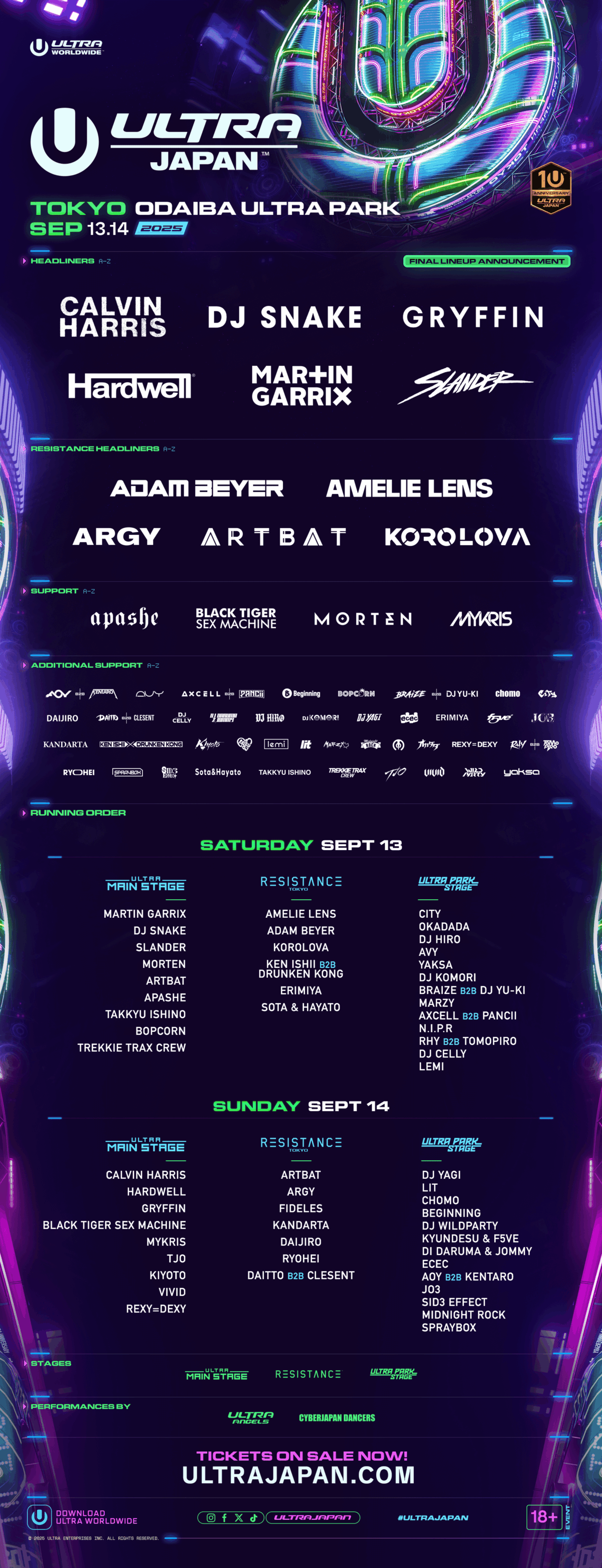 ULTRA JAPAN 2025 is Japan’s premier electronic dance music (EDM) festival, taking place on September 13–14, 2025, at Tokyo Odaiba Ultra Park. Celebrating its 10th anniversary, this global event, part of the Ultra Worldwide circuit, features world-class DJs, immersive stage setups, and a vibrant atmosphere. With performances across the ULTRA MAIN STAGE and RESISTANCE STAGE, attendees can expect high-energy sets, stunning visuals, and a unique festival experience. The event attracts thousands, offering spaces to relax between sets on air cushions or enjoy picnics.