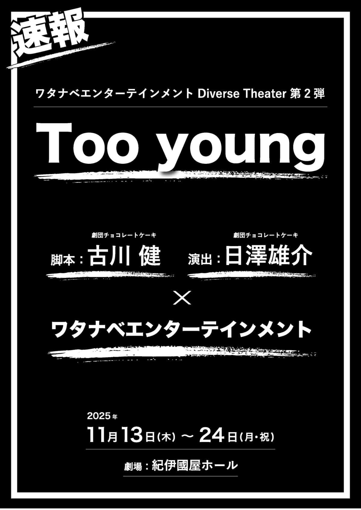 - Innovative Theater: Part of Watanabe Entertainment’s Diverse Theater project, Too Young offers a bold, experimental narrative crafted by Ken Furukawa and Yusuke Hizawa.