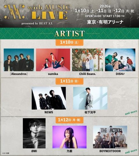 This three-night residency from Saturday, January 10, to Monday, January 12, 2026 (holiday), at the state-of-the-art Ariake Arena in Koto-ku, kicks off each evening at 17:00 (doors 16:00), delivering ~180–240 minute lineups of high-energy sets that span indie rock to idol pop, with potential collabs and encores under the arena’s soaring sail roof. Day 1 spotlights ** [ALEXANDROS]** (indie rock staples like “wanna be normal” and “Trigger”), sumika (uplifting anthems such as “Lovers” and “Good Night”), Chili Beans. (fresh fusion grooves), and DISH// (energetic hits like “Neko”); Day 2 features NEWS (Johnny’s idol powerhouses with “U R not alone”), Kohei Matsushita (soulful vocals from The First Take fame), and others TBD; Day 3 brings OMI (global “Cheerleader” vibes), Nomurasaki (rising J-rock), BOYNEXTDOOR (K-pop rookies with “Earth, Wind & Fire”), and more surprises.