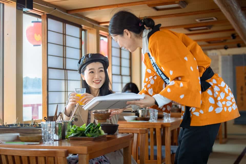 Begin your journey at Etchūjima Pier, where a warm welcome from the crew awaits. Once aboard, enjoy the serene ambiance of the lantern-lit interior as you’re seated in the spacious dining cabin. Dine on a classic Japanese sukiyaki hot pot meal (pork and vegetarian options available upon request) while sipping unlimited soft drinks.