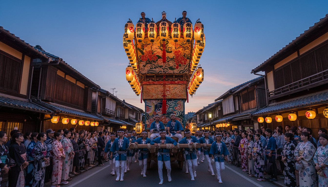 The sound of festival music fills the Kyoto air, and massive, ornate floats prepare to parade through the historic streets.